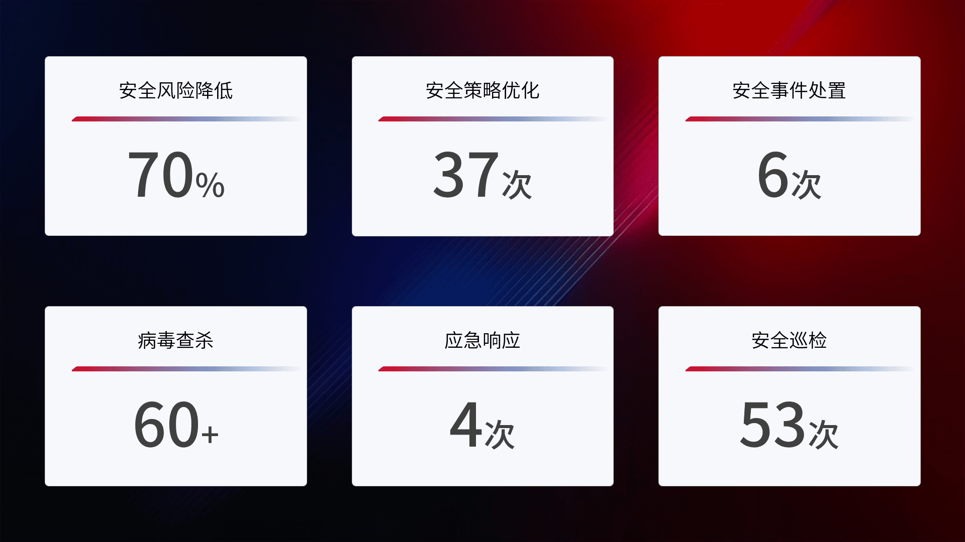 提供全面的安全事件报告体系,,包括处置报告、、、周报、、季度和年度总结,,,,结合持续监控,,,,帮助客户深入了解网络安全状况。。